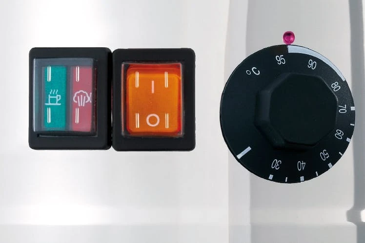 mit manuell einstellbarem Thermostatregler für Temperaturen von ca. 30 bis 90 Grad.