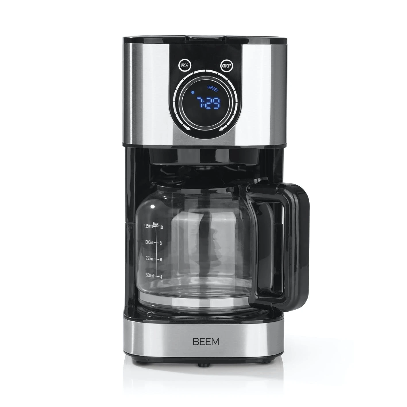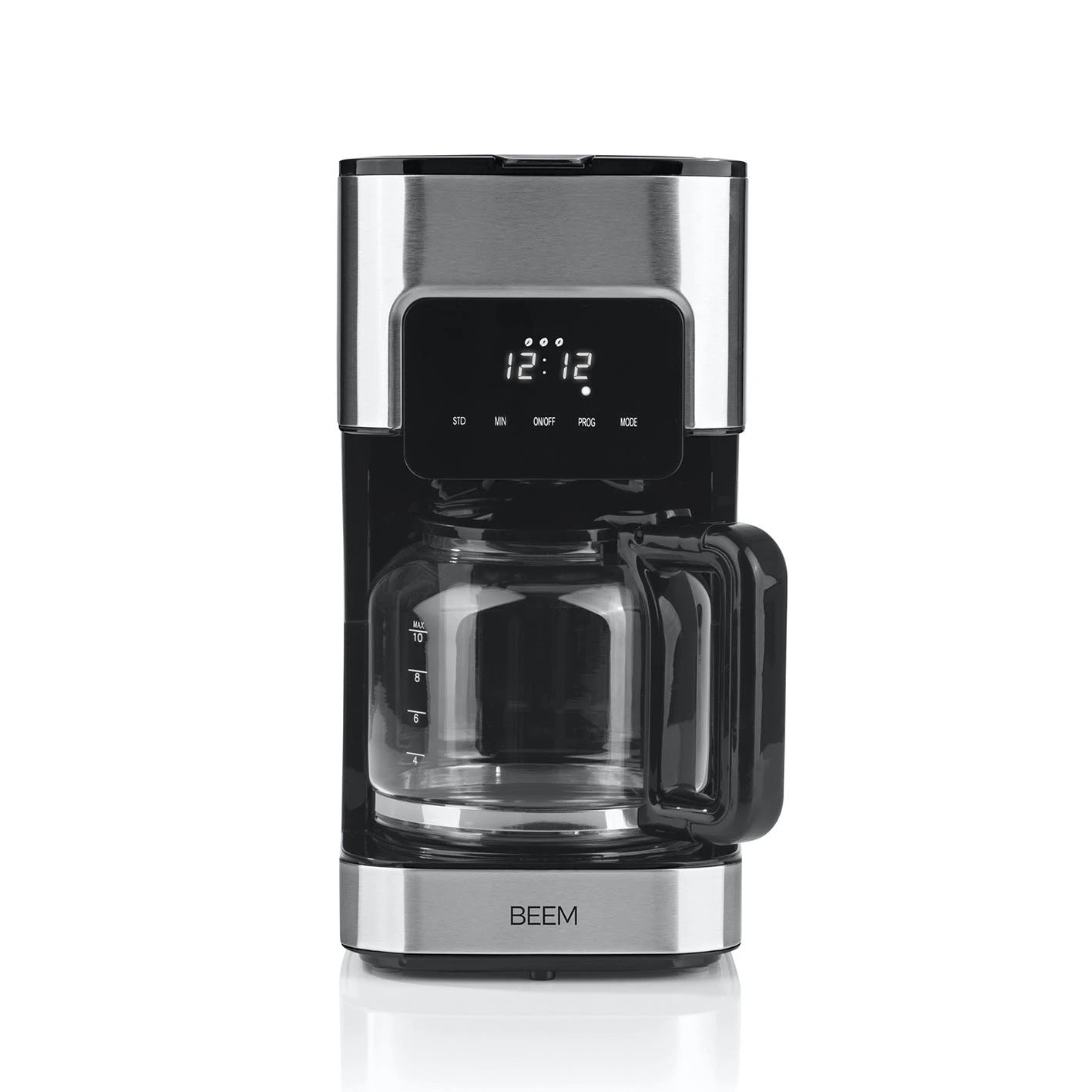 Kaffeegenuss in Ruhe oder mit Freunden – die BEEM FRESH-AROMA-PURE Filterkaffeemaschine macht´s möglich. Bis zu 10 Tassen können in der formschönen Glaskanne bereitgestellt werden. Die besonders einfache und damit unkomplizierte Bedienung über nur einen Knopf sowie moderne Komfort-Funktionen wie Tropfstopp und außenstehende Wasserfüllmengen-Anzeige machen diese Filterkaffeemaschine ideal für alle, die einfach nur Kaffee möchten. Kompakt und in zeitlos schlichter Edelstahl-Eleganz integriert sich die BEEM FRESH-AROMA-PURE in jede Küche.