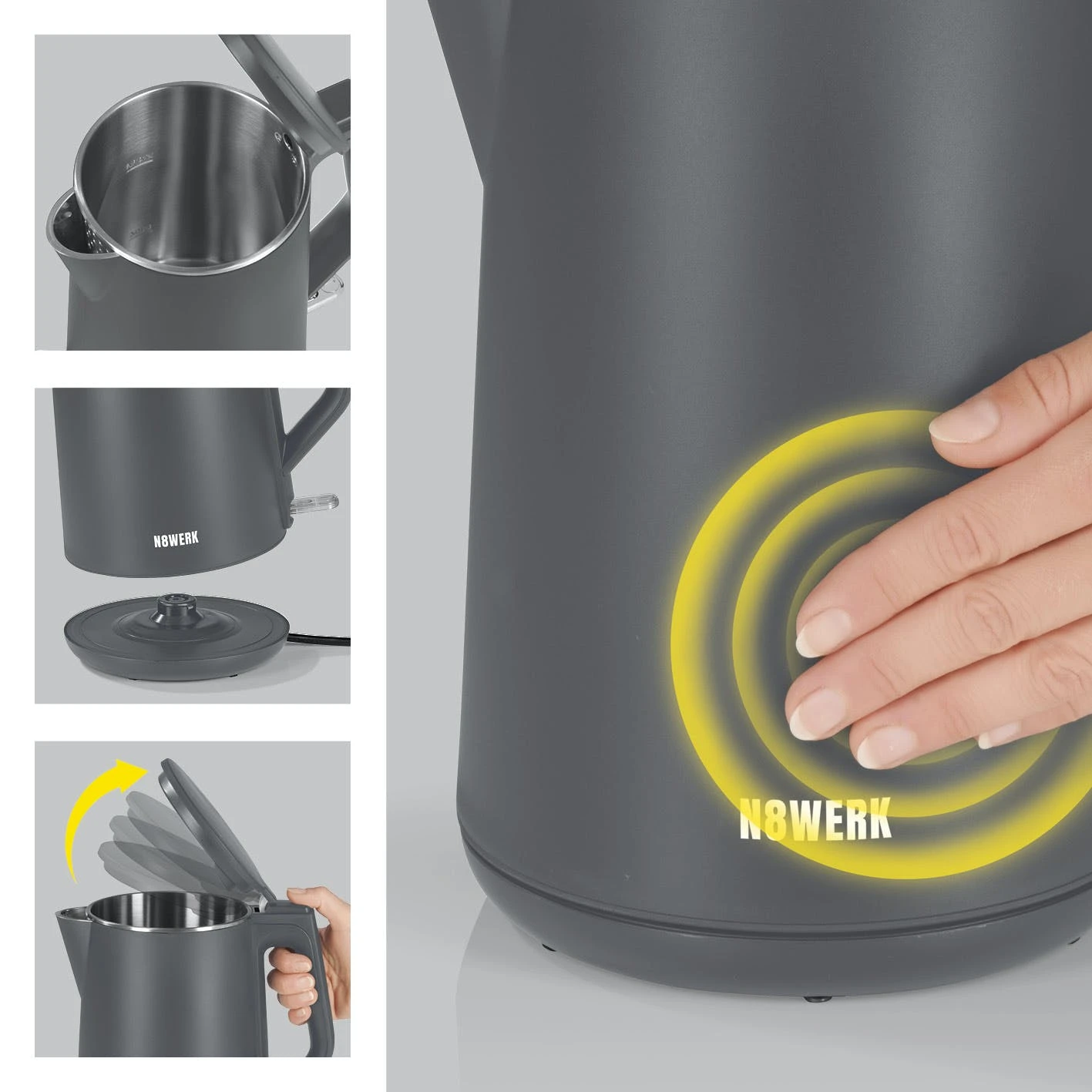 Weitere Funktionen für Ihren Bedienkomfort: Trockengehschutz, Überhitzungsschutz, verdecktes Heizelement für einfache Reinigung, Ein/Aus-Schalter mit LED Licht, Basisstation mit Kabelaufbewahrung. Einfach. Stylish. Der N8WERK Wasserkocher in der Nordic Grey Edition.