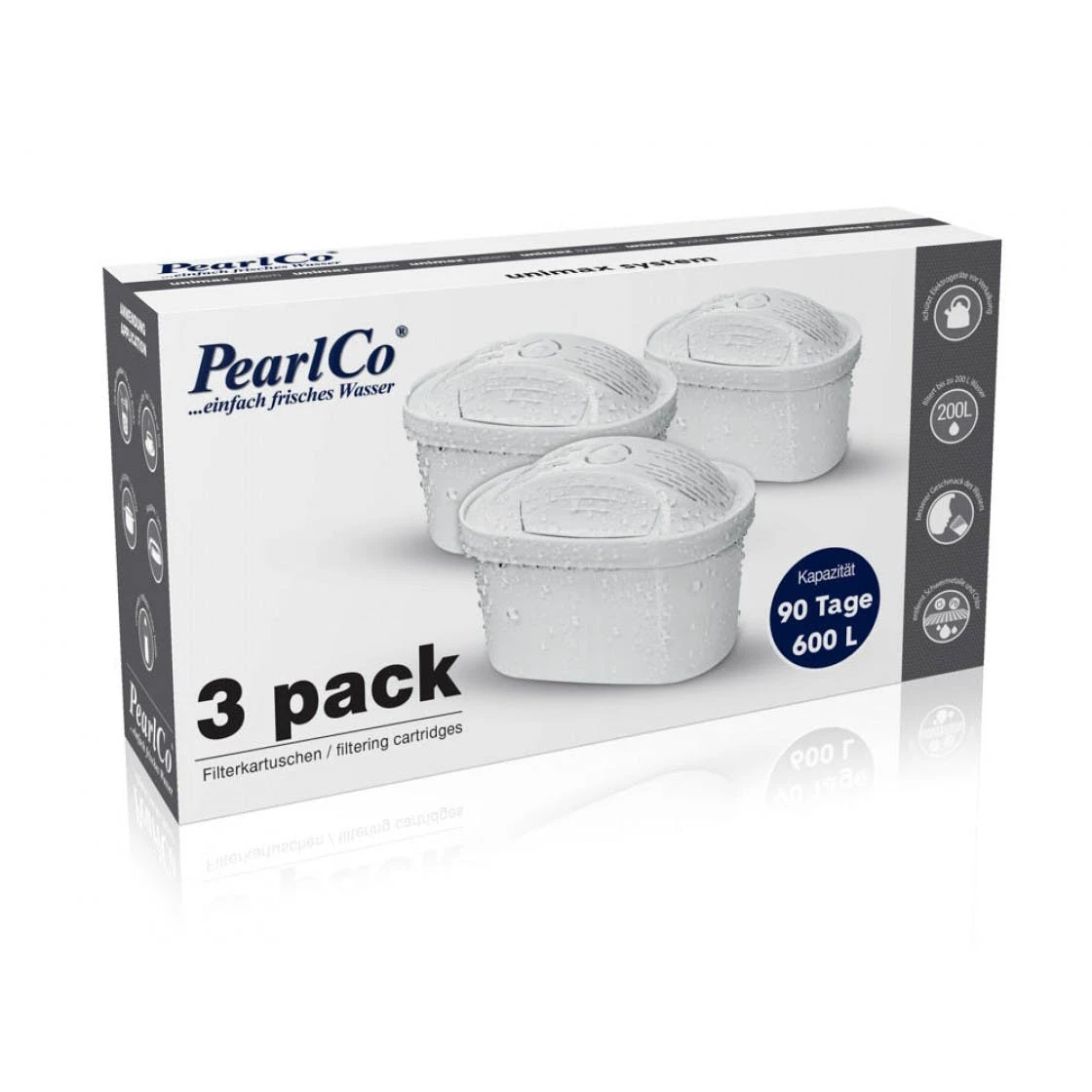 Ökologisch Vermeidung von Plastikmüll Sparsam Verzichten Sie auf Plastikflaschen Reiner Geschmack Speisen und Getränke entfalten ihr volles Aroma PearlCo unimax Universal PearlCo unimax Wasserfilter-Kartuschen optimieren ihr Leitungswasser mit hygienischer Filtertechnik. Der Kalkgehalt des Wassers wird deutlich reduziert, ebenso der Anteil an Schadstoffen wie Blei und anderen Schwermetallen. Gleiches gilt für geschmacklich störendes Chlor und viele weitere, im Trinkwasser unerwünschte Stoffe. Die Filterung erzeugt aromatisches, geschmackvolles Wasser, das für die Zubereitung von Speisen und Getränken oft viel besser geeignet ist als ungefiltertes Leitungswasser. Besonders groß ist der Unterschied bei Tee und Kaffee: Beide Getränke werden nicht nur sichtbar klarer, sondern schmecken auch deutlich besser! Bei der Zubereitung heißer Getränke fallen die Vorteile der Kalkreduzierung zudem besonders ins Gewicht: Kaffeemaschinen, Wasserkocher und ähnliche elektrische Geräte verkalken bei der Verwendung PearlCo-gefilterten Wassers viel weniger und halten deshalb auch länger.