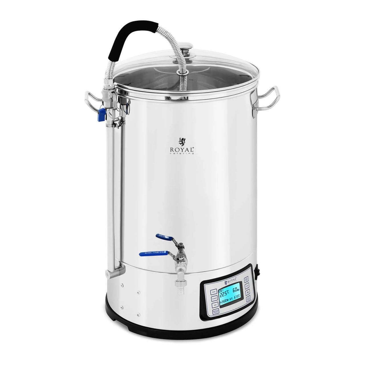 Der Edelstahlkessel weist eine Kapazit„t von 62 l auf, was einem Arbeitsvolumen von 60 l entspricht. Fr die genaue Zugabe der Zutaten sorgt die Skala in Literschritten. Eine Platine regelt die Programmeinstellungen, sodass der Brauprozess pr„zise durchlaufen wird. Dafr erlaubt das intuitiv zu bedienende Touch-Control-Panel Zugriff auf die vielen Funktionen. Alle Prozessphasen und Parameter werden auf der LCD-Anzeige angezeigt.