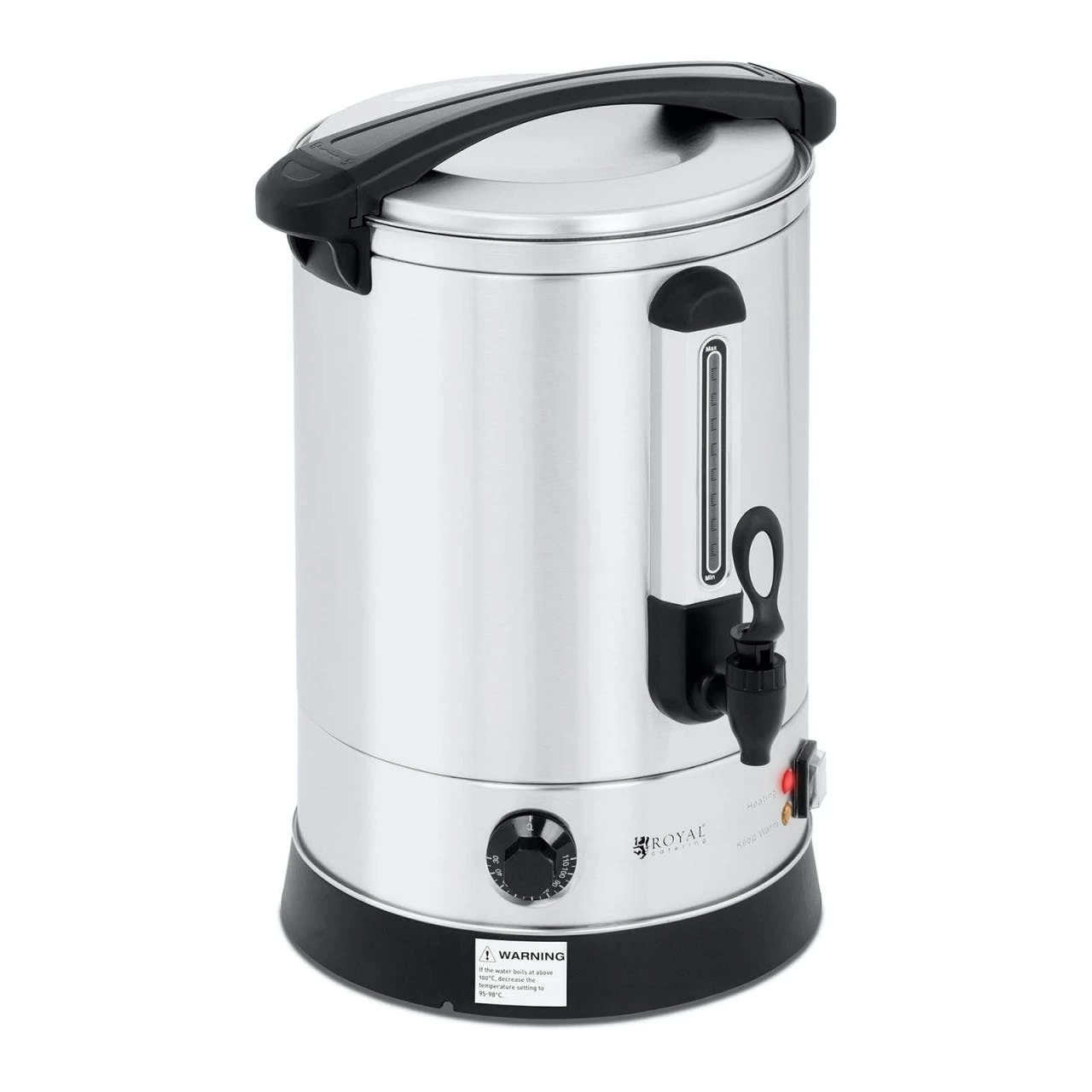 Wasserkocher – 14.5 L – 2.500 W – doppelwandig. Macht nicht nur Wasser heiß! Der schnelle Wasserkocher mit 2.500 W. Der Wasserkocher RC-WBDW14 von Royal Catering. den Experten für hochwertigen Gastronomiebedarf. ist der ideale Helfer für das Erhitzen und Warmhalten unterschiedlichster Heißgetränke. Der Wasserkocher doppelwandig fasst 14.5 l Flüssigkeit und hat damit die ideale Größe für den Einsatz in Restaurants. Hotels und Kantinen sowie auf Jahrmärkten. Festivals oder Weihnachtsmärkten. Warmhalten in Perfektion mit dem Heißwasserspender von Royal Catering. Das in diesem Heißwasserbereiter eingebaute Präzisionsthermostat erhitzt Getränke dank einer Leistung von 2.500 W schnell auf Temperaturen zwischen von 30 und 110 °C. über einen Drehregler ist dieser Temperaturbereich stufenlos einstellbar. Dank der praktischen Warmhaltefunktion bleibt der Inhalt stets servierbereit bei der am Drehregler gewählten Temperatur. Zwei Kontrollleuchten zeigen Ihnen den Status von Heiz- bzw. Warmhaltefunktion an. Mit dem Sichtfenster haben Sie immer im Blick. wann Sie nachfüllen müssen. ohne den Behälter zu öffnen. Und wenn Ihnen mal nicht nach heißem Wasser ist. erhitzen Sie doch einfach Kaffee. Kakao. Tee oder Glühwein in dem Heißgetränkespender. Dabei erweist sich die doppelwandige Konstruktion des Glühweinkochers aufgrund ihrer Isolierung als besonders energieeffizient. Weiterer Vorteil: Dank der Doppelwand bleiben kalte Getränke im Inneren kalt und können ebenfalls präzise portioniert mit dem Ablasshahn ausgeschenkt werden. Damit Sie sich nicht die Finger verbrennen. verfügt der Wasserkocher Edelstahl seitlich über wärmeisolierte Tragegriffe. Auch das Anheben des robusten Deckels ist anhand eines breiten Griffes risikolos möglich – Sie kommen dabei nicht mit dem Gehäuse in Berührung. Durch die große öffnung lässt sich der Heißwasserkocher in Sekundenschnelle befüllen und dank Verschlussmechanismus wieder luftdicht verriegeln. Sollte der Wasserboiler einmal zu heiß werden. schaltet der überhitzungsschutz das Gerät automatisch ab. Die verwendeten Materialien. wie der lebensmittelechte Edelstahl. sind nicht nur sehr hygienisch und langlebig. sondern auch außerordentlich pflegeleicht. Entscheiden Sie sich jetzt für den Heißgetränkespender von Royal Catering – alles andere ist kalter Kaffee!