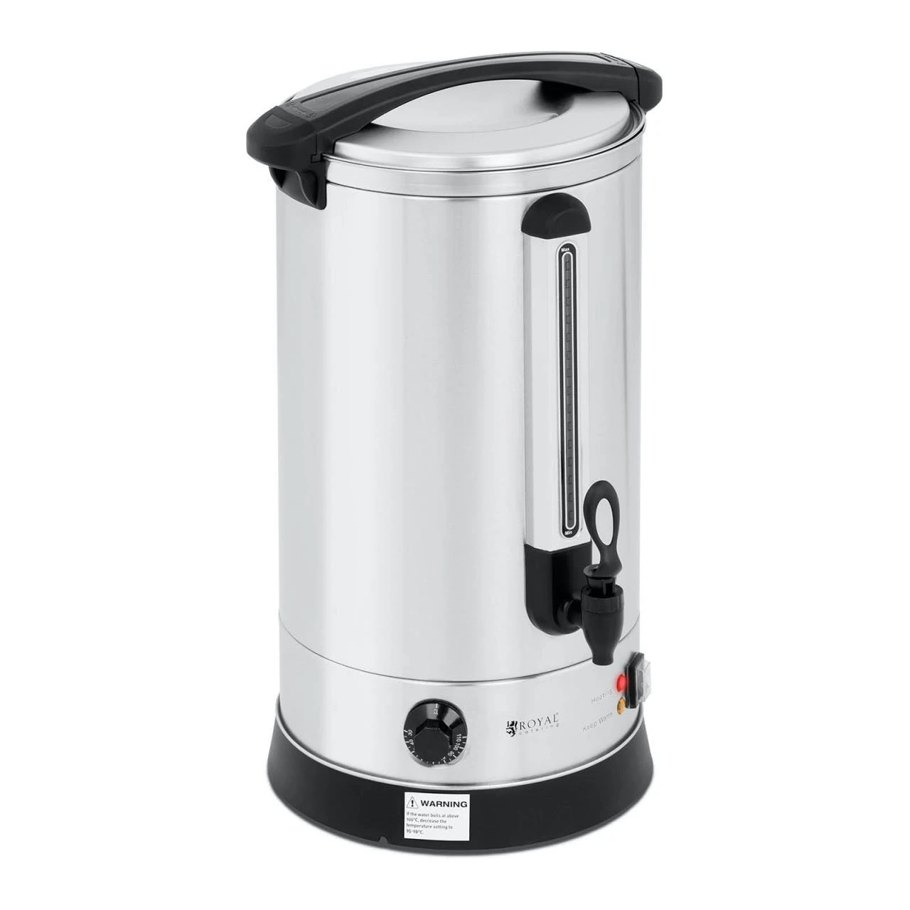 Wasserkocher – 20.5 L – 2.500 W – doppelwandig. Macht nicht nur Wasser heiß! Der schnelle Wasserkocher mit 2.500 W. Der Wasserkocher RC-WBDW20 von Royal Catering. den Experten für hochwertigen Gastronomiebedarf. ist der ideale Helfer für das Erhitzen und Warmhalten unterschiedlichster Heißgetränke. Der Wasserkocher doppelwandig fasst 20.5 l Flüssigkeit und hat damit die ideale Größe für den Einsatz in Restaurants. Hotels und Kantinen sowie auf Jahrmärkten. Festivals oder Weihnachtsmärkten. Warmhalten in Perfektion mit dem Heißwasserspender von Royal Catering. Das in diesem Heißwasserbereiter eingebaute Präzisionsthermostat erhitzt Getränke dank einer Leistung von 2.500 W schnell auf Temperaturen zwischen von 30 und 110 °C. über einen Drehregler ist dieser Temperaturbereich stufenlos einstellbar. Dank der praktischen Warmhaltefunktion bleibt der Inhalt stets servierbereit bei der am Drehregler gewählten Temperatur. Zwei Kontrollleuchten zeigen Ihnen den Status von Heiz- bzw. Warmhaltefunktion an. Mit dem Sichtfenster haben Sie immer im Blick. wann Sie nachfüllen müssen. ohne den Behälter zu öffnen. Und wenn Ihnen mal nicht nach heißem Wasser ist. erhitzen Sie doch einfach Kaffee. Kakao. Tee oder Glühwein in dem Heißgetränkespender. Dabei erweist sich die doppelwandige Konstruktion des Glühweinkochers aufgrund ihrer Isolierung als besonders energieeffizient. Weiterer Vorteil: Aufgrund der Doppelwand bleiben kalte Getränke im Inneren kalt und können ebenfalls präzise portioniert mit dem Ablasshahn ausgeschenkt werden. Damit Sie sich nicht die Finger verbrennen. verfügt der Wasserkocher Edelstahl seitlich über wärmeisolierte Tragegriffe. Auch das Anheben des robusten Deckels ist anhand eines breiten Griffes risikolos möglich – Sie kommen dabei nicht mit dem Gehäuse in Berührung. Durch die große öffnung lässt sich der Heißwasserkocher in Sekundenschnelle befüllen und dank Verschlussmechanismus wieder luftdicht verriegeln. Sollte der Wasserboiler einmal zu heiß werden. schaltet der überhitzungsschutz das Gerät automatisch ab. Die verwendeten Materialien. wie der lebensmittelechte Edelstahl. sind nicht nur sehr hygienisch und langlebig. sondern auch außerordentlich pflegeleicht. Entscheiden Sie sich jetzt für den Heißgetränkespender von Royal Catering – alles andere ist kalter Kaffee!