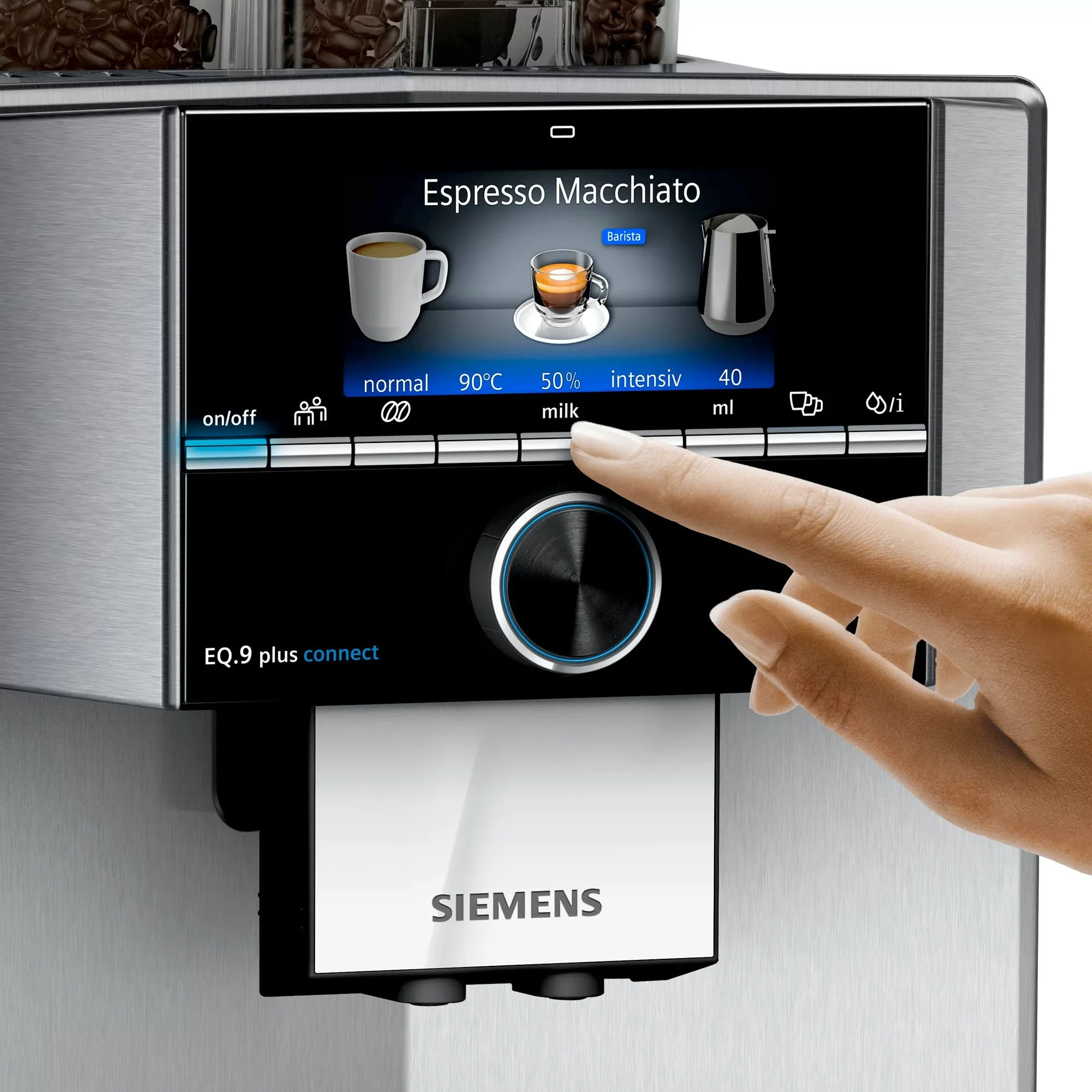 Siemens TI9575X7DE. Produkttyp: Espressomaschine, Kaffeezubereitungstyp: Vollautomatisch, Fassungsvermögen Wassertank: 2,3 l, Kaffee-Einfüllart: Kaffeebohnen, Gemahlener Kaffee, Behälter für gebrühten Kaffee: Tasse, Kapazität (in Tassen): 2 Tassen, Anzahl der Ausflüsse: 2, Eingebautes Mahlwerk. Display-Typ: TFT. Leistung: 1500 W. Produktfarbe: Schwarz, Edelstahl